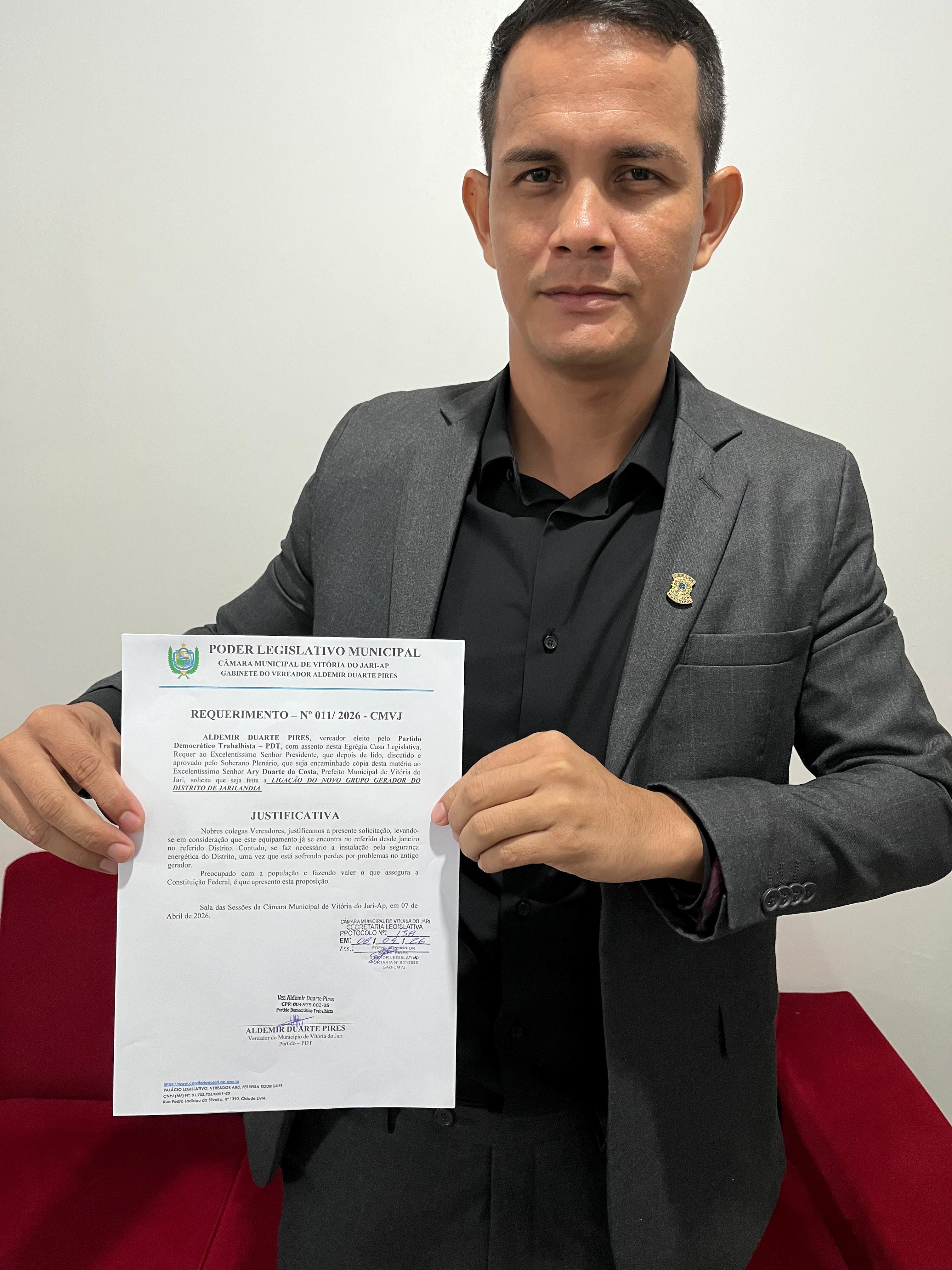 Na manhã desta sexta (10), o vereador Aldemir Duarte Pires – PDT apresentou em plenários cinco requerimentos, o primeiro de Requerimento de Nº 010/2026-CMVJ, solicitando que seja feita a construção da passrela Tapaiuna no Rio Cajari, o segundo requerimento de nº 011/2026 - CMVJ, solicitando que seja feita a ligação do novo grupo gerador do distrito de Jarilândia, o terceiro requerimento de nº 012/2026 - CMVJ, solicitando que que seja feita a manutenção da estrada de Jarilândia, o quarto requerimento de nº 013/2026 - CMVJ, solicitando que seja feita a finalização da casa dos grupos geradores do Distrito de Jarilandia, o quinto requerimento de nº 014/2026 -CMVJ, solicitando que seja feita a aquisição de lixeiras para as comunidades rurais.