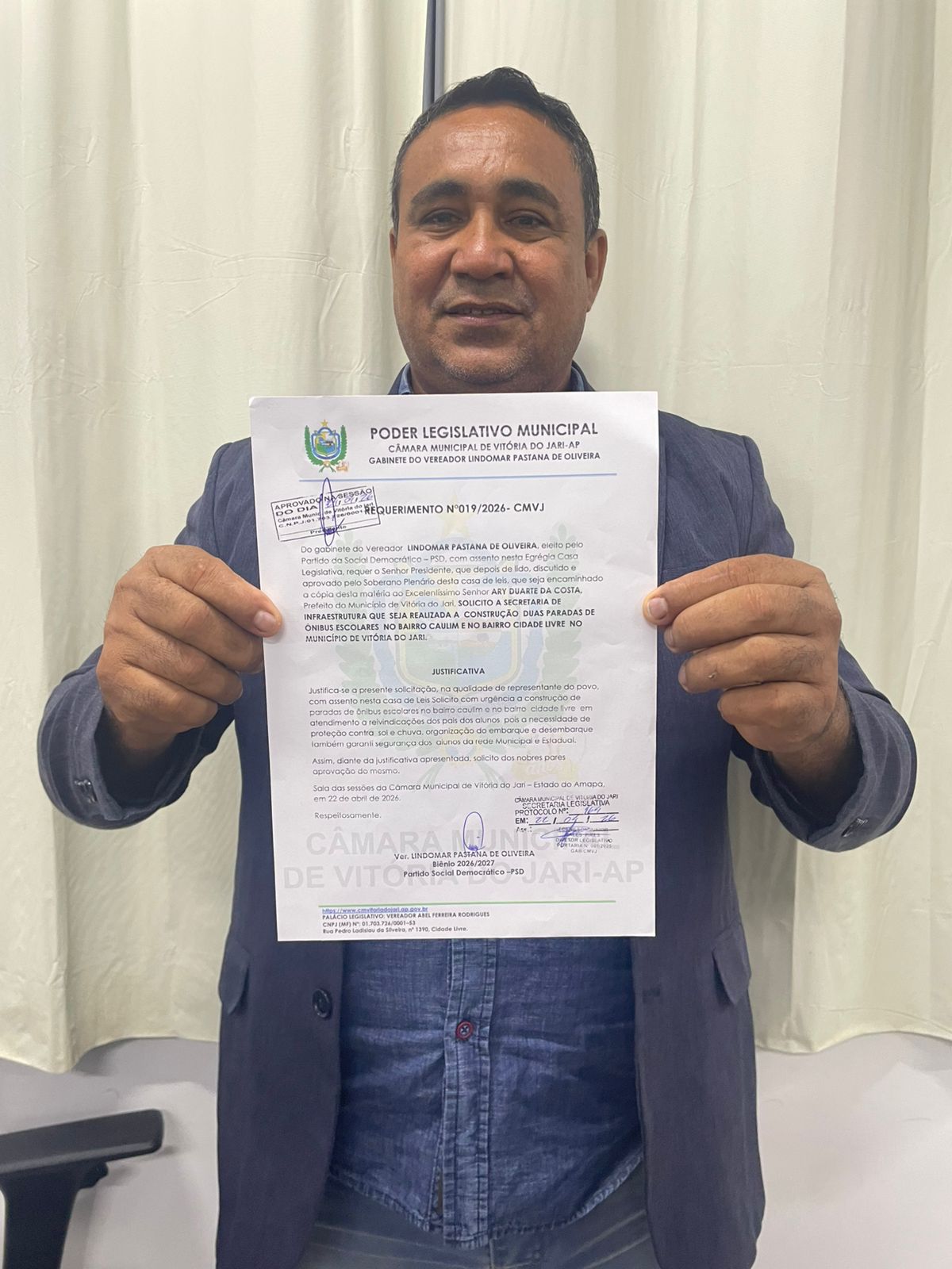 Na manhã desta sexta (24), o vereador Lindomar Pastana de Oliveira – PSD, apresentou em plenários um Requerimento de Nº 019/2026-CMVJ, solicitando a Secretaria de Infraestrutura que seja realizada a construção de duas paradas de ônibus escolares no bairro Caulim e no bairro Cidade Livre no Município de Vitória do Jari.